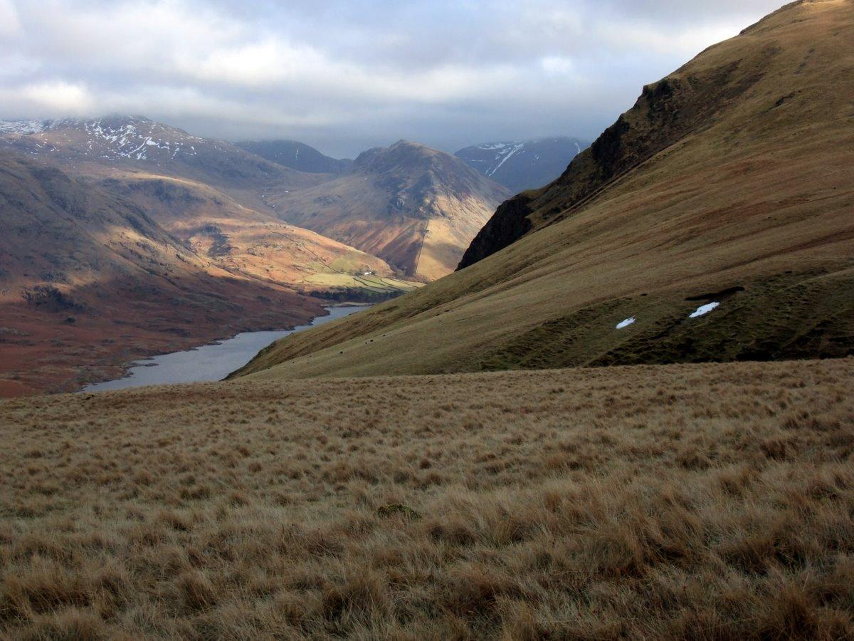 Buckbarrow in the sun with the whaleback of Seatallan beyond.
