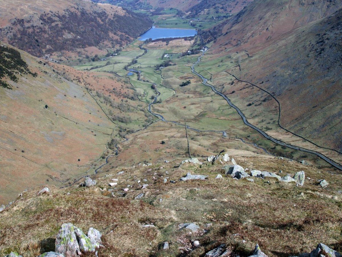 Kirkstone Pass below with Middle Dodd in the sunshine.