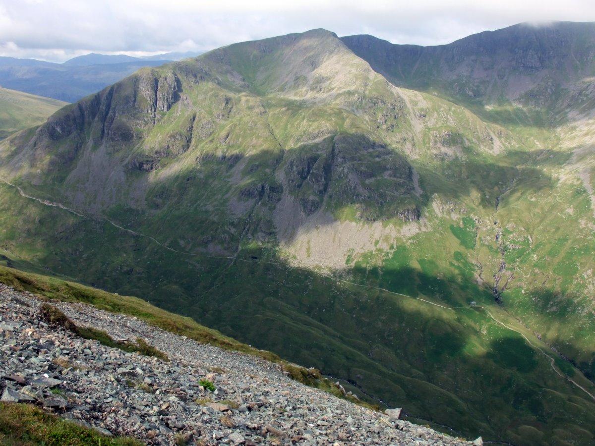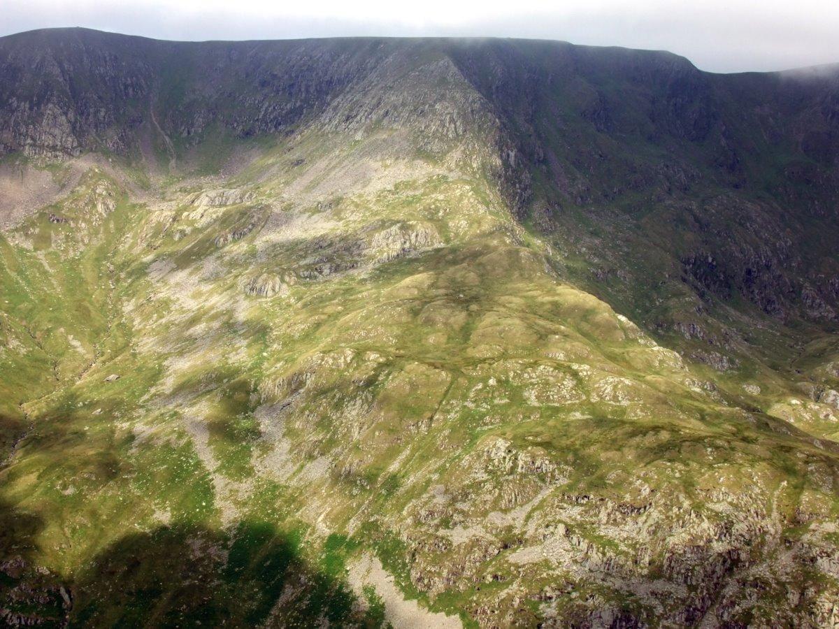 Catstycam poking up behind Striding Edge. Helvellyn in the clouds on far left.
