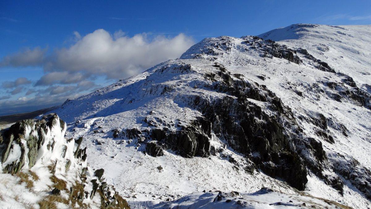 Sunlit top of Selside in the distance.