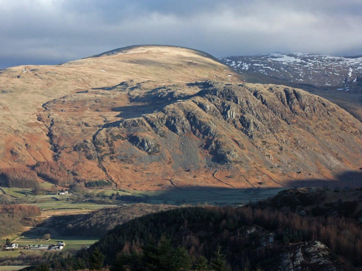 Buckbarrow in the sun with the whaleback of Seatallan beyond.