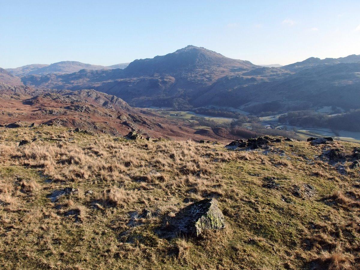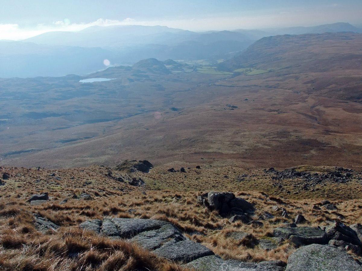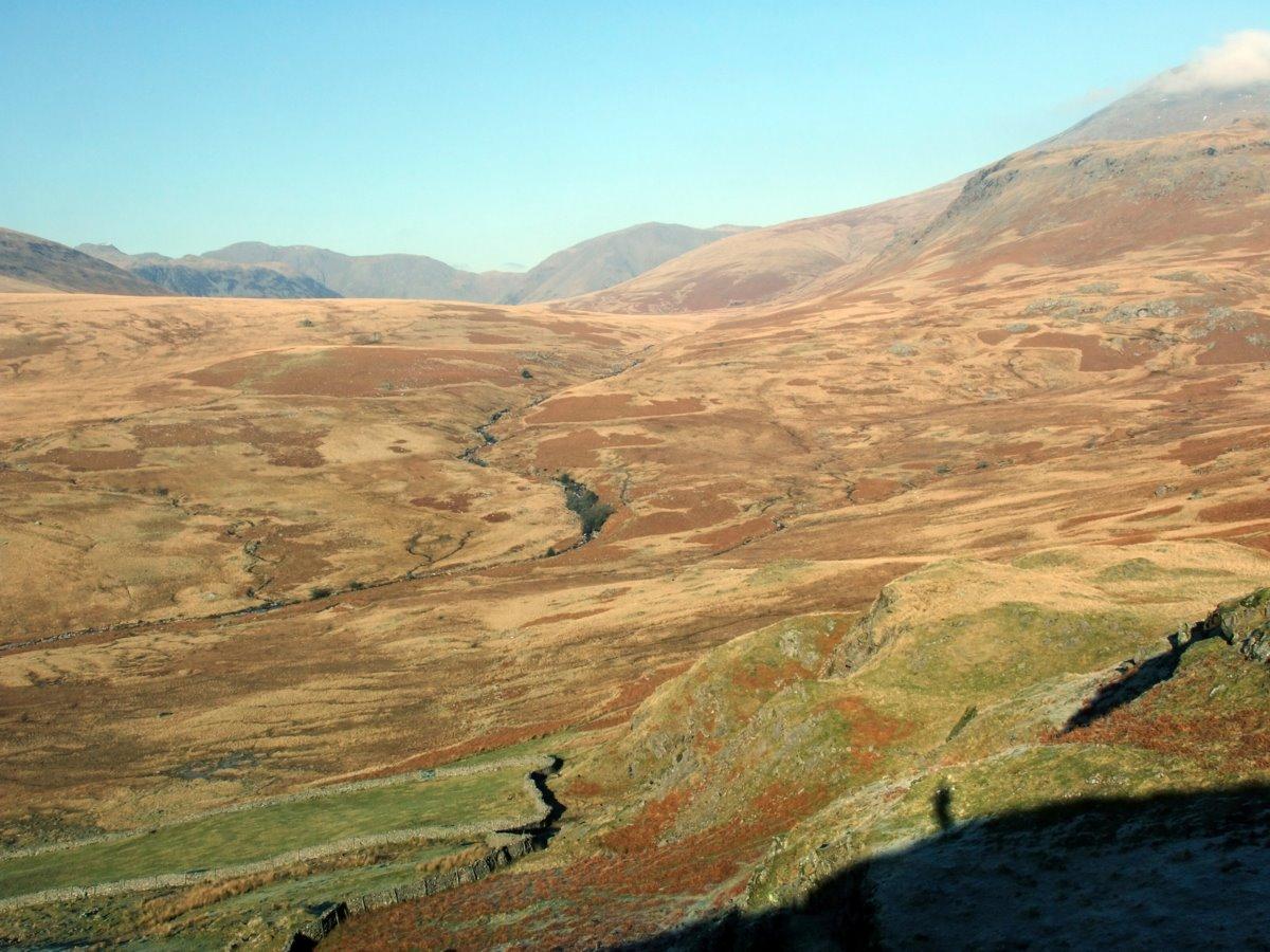 Quagrigg Moss from Great How. Bowfell and the Crinkles on the skyline.
