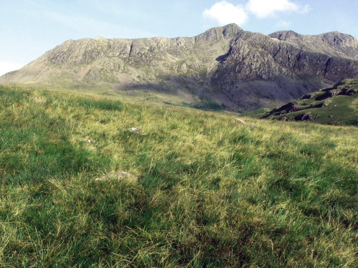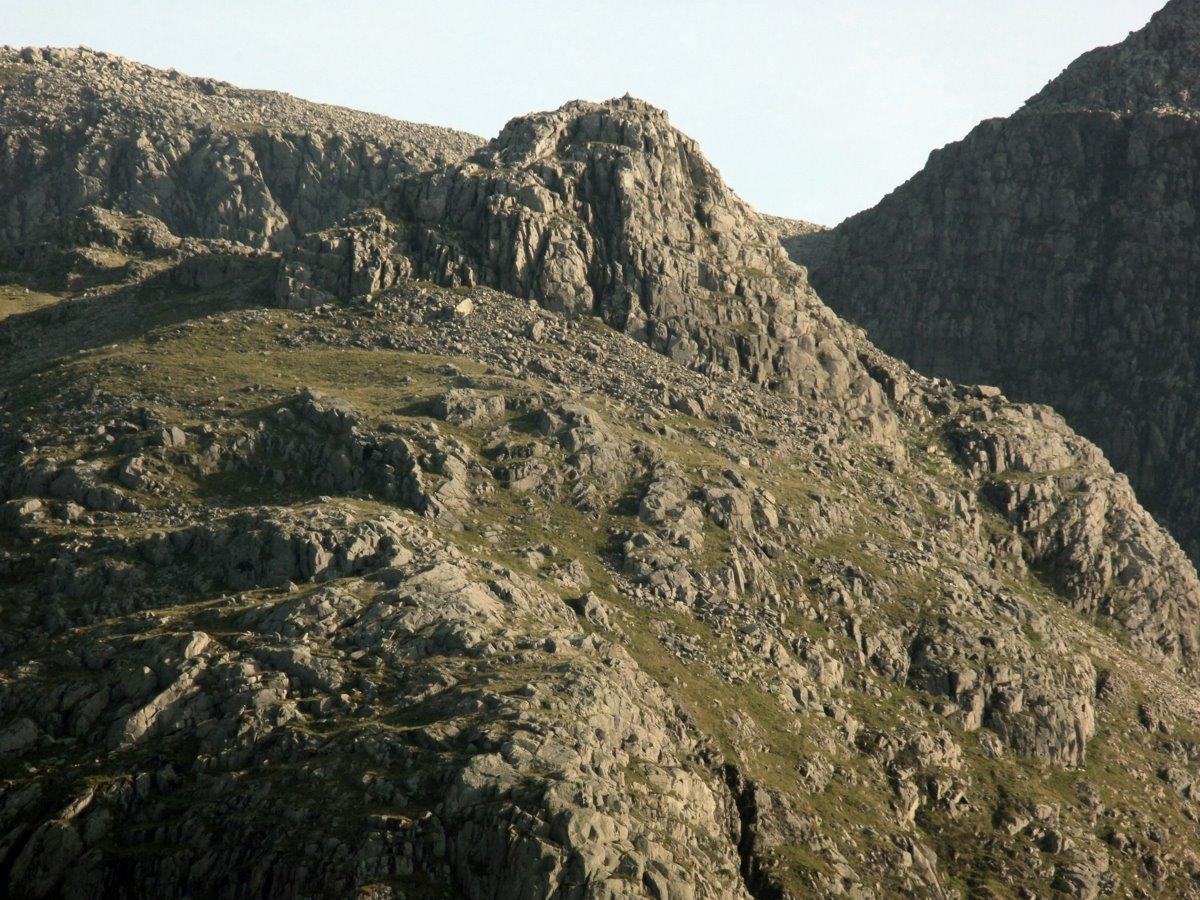 Cam Spout Crag rising diagonally leftward.