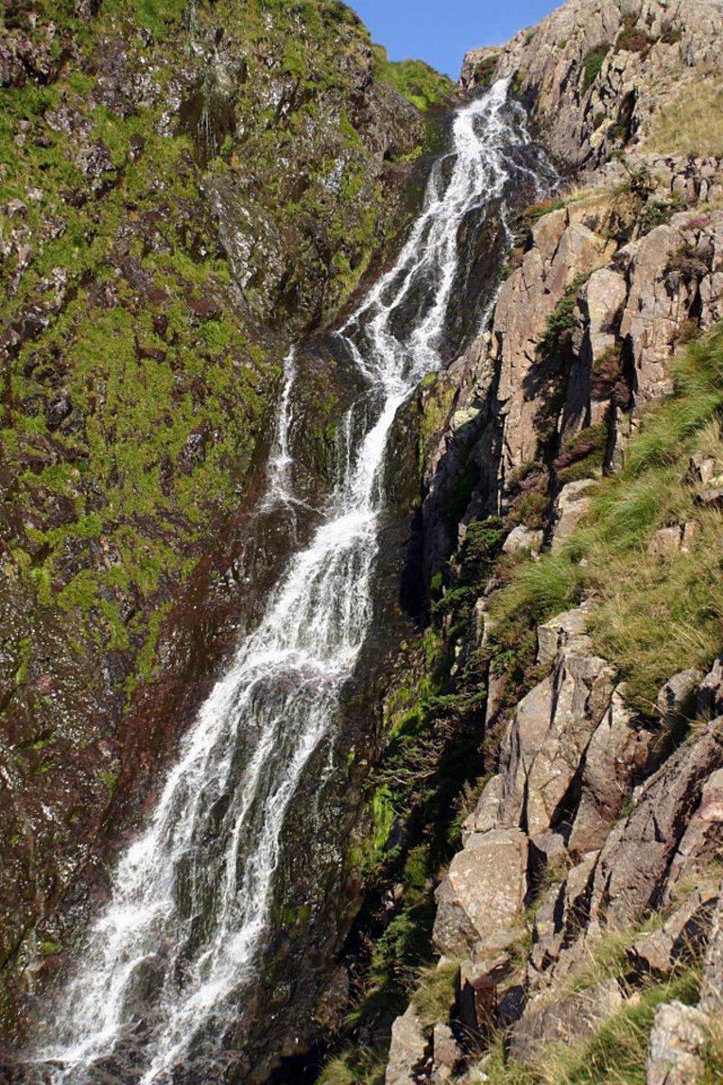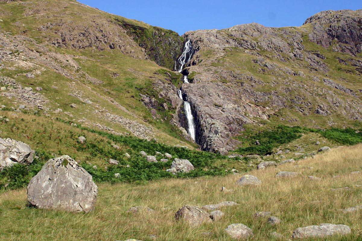 The track climbs the rocks right of the falls.