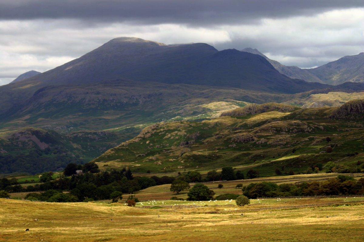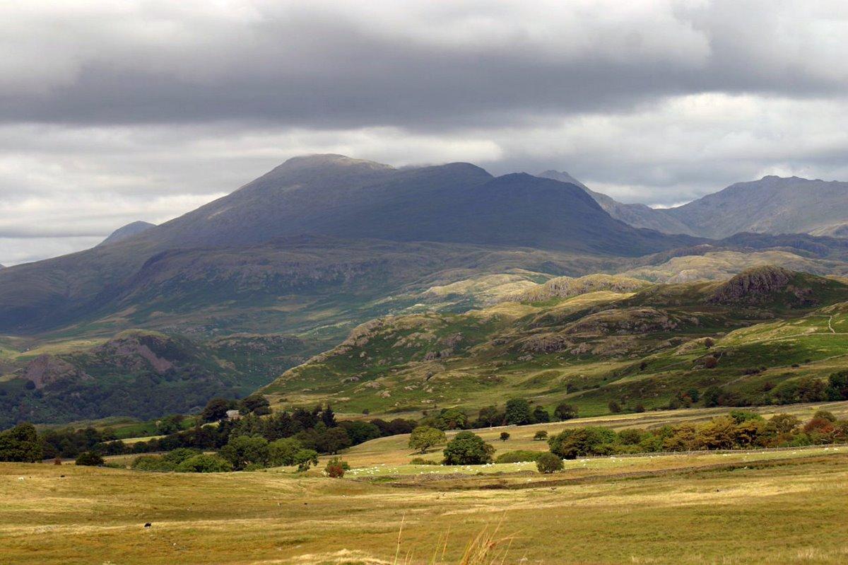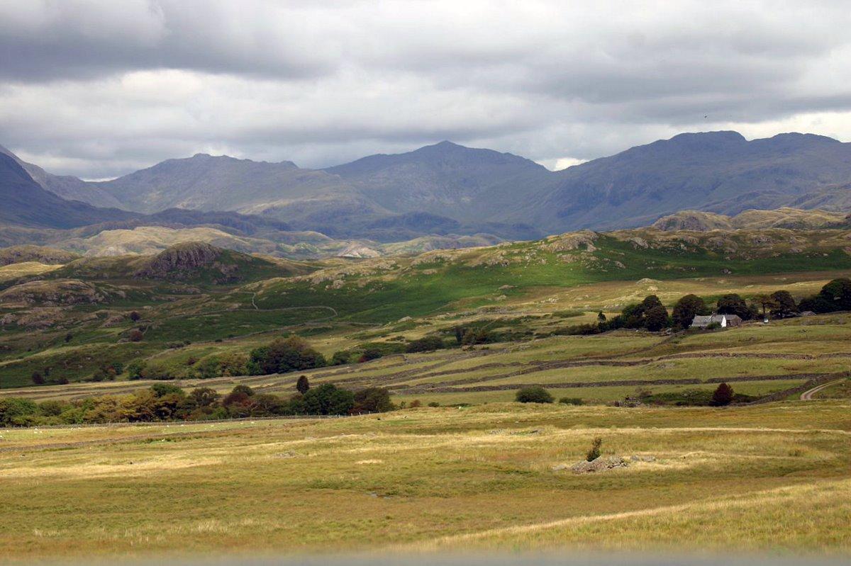 The view North from Birker Fell with pointy Ill Crag centre skyline.