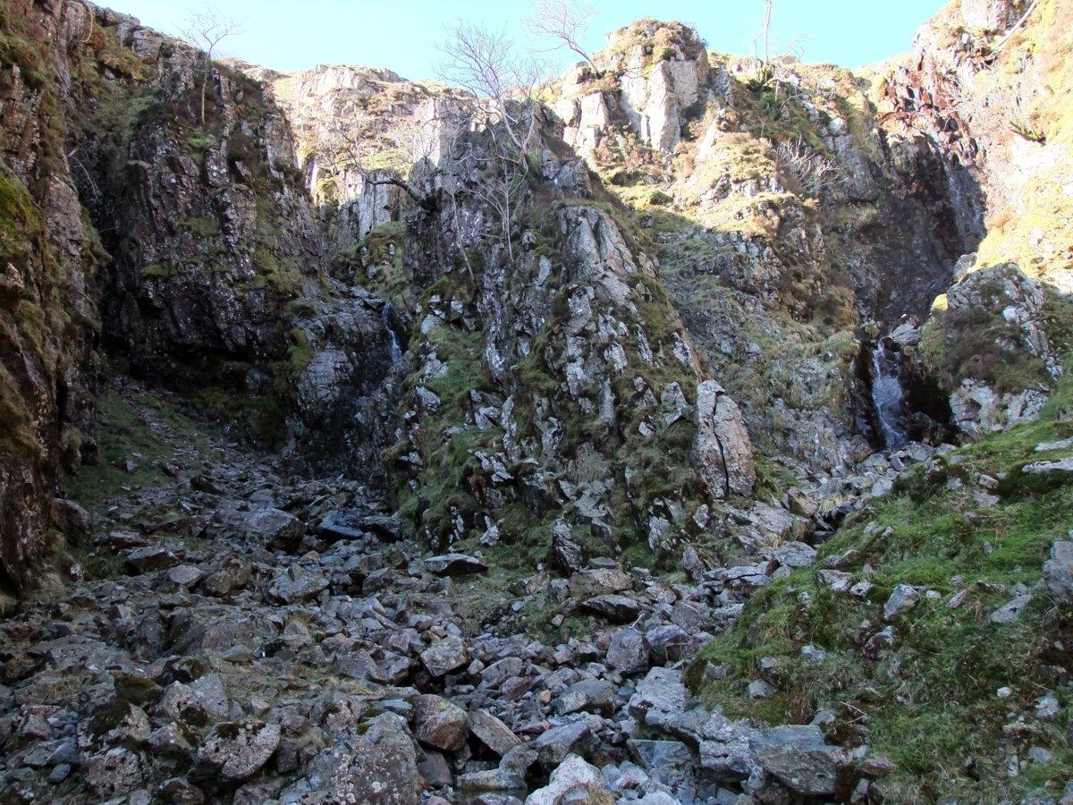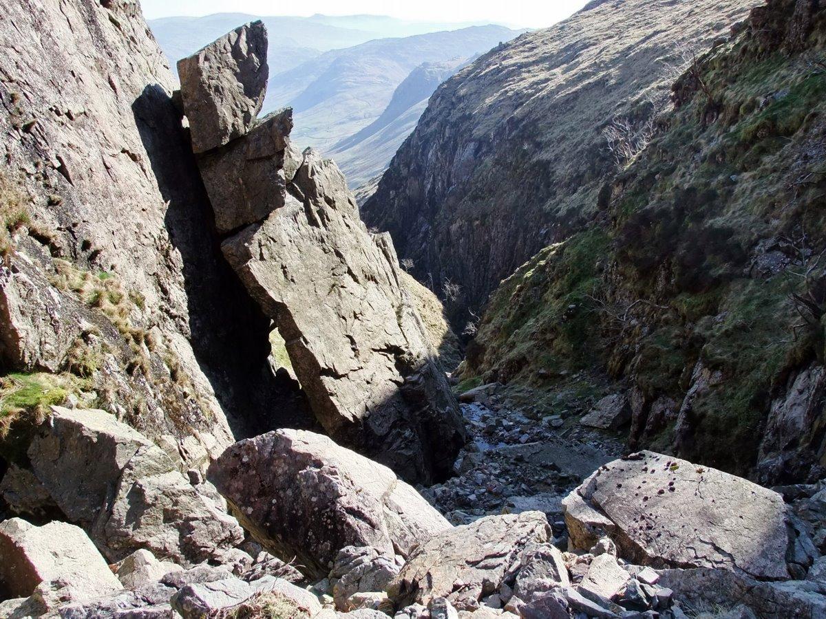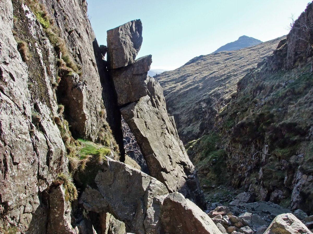Crinkle Gill. Ahead the fallen slab of rock.