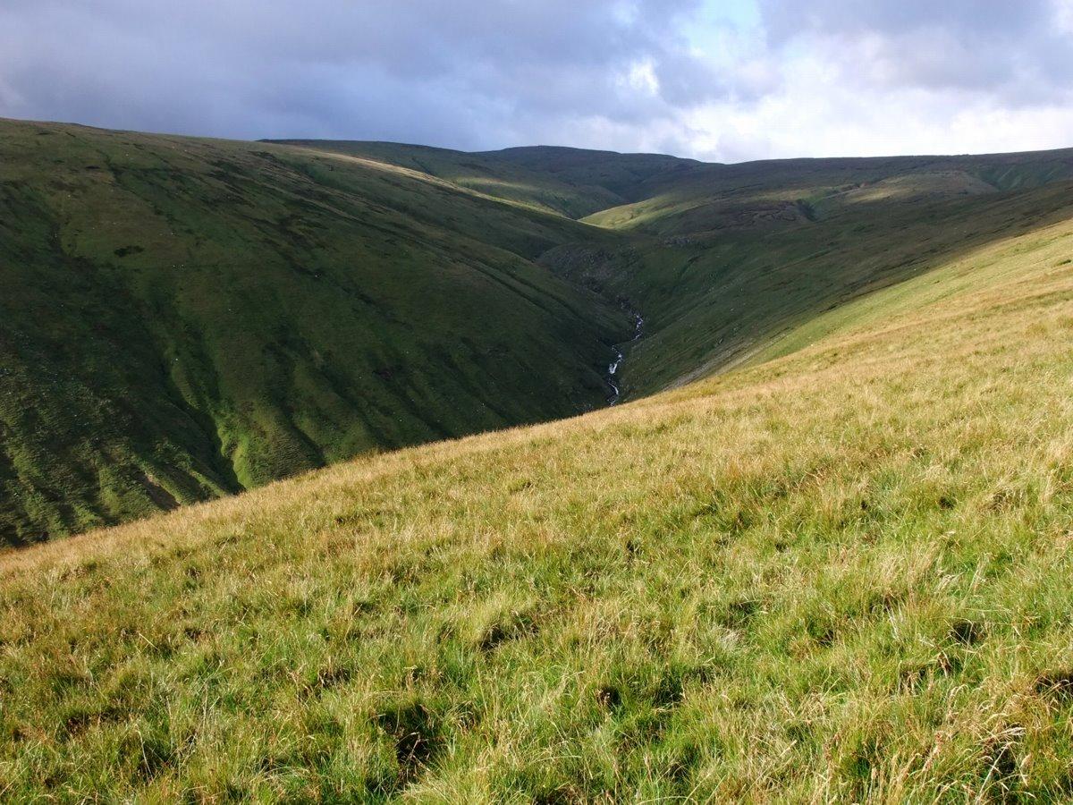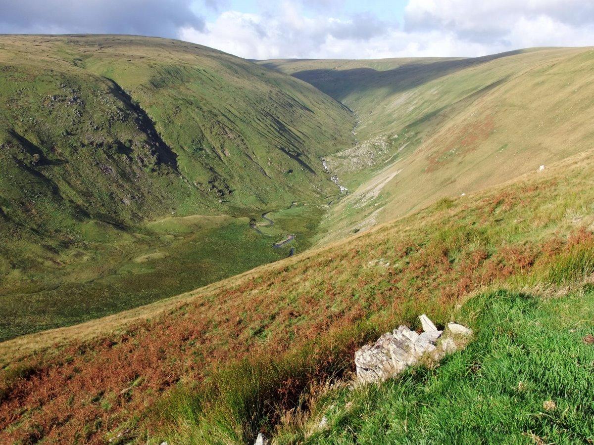 Traversing Tail o' Ling. Low Raise and High Raise on the skyline at the head of Measand Beck.