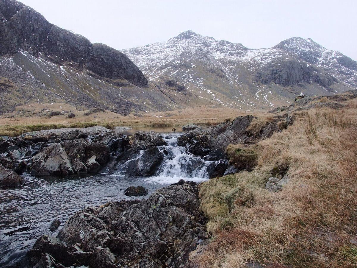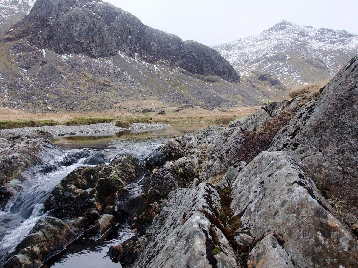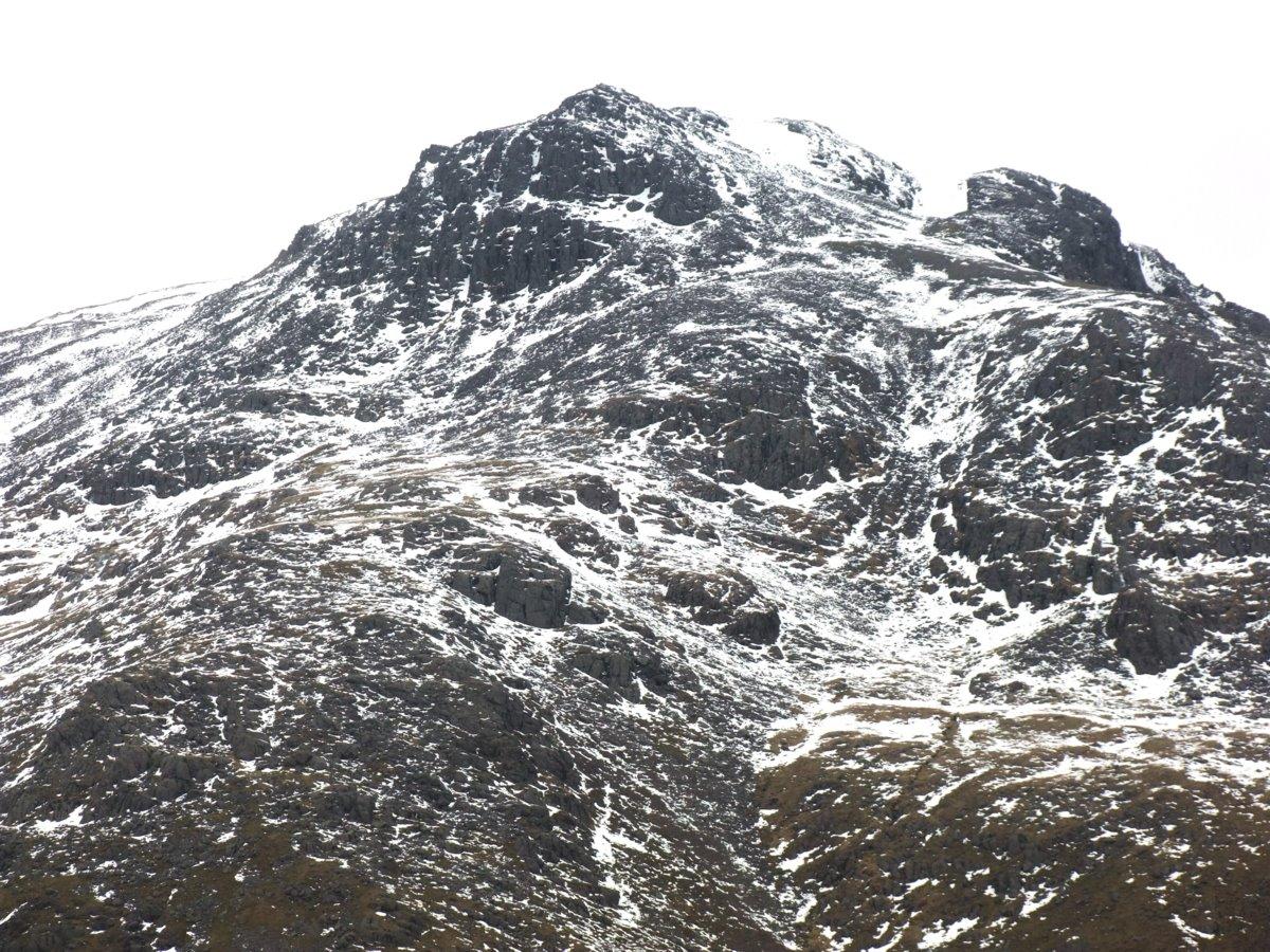 Cam Spout Crag on the left with Scafell Pike and Ill Crag further down Great Moss.