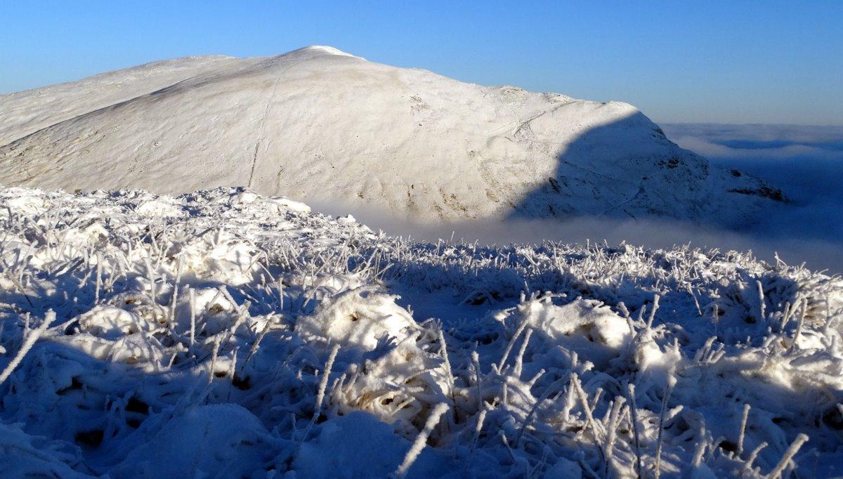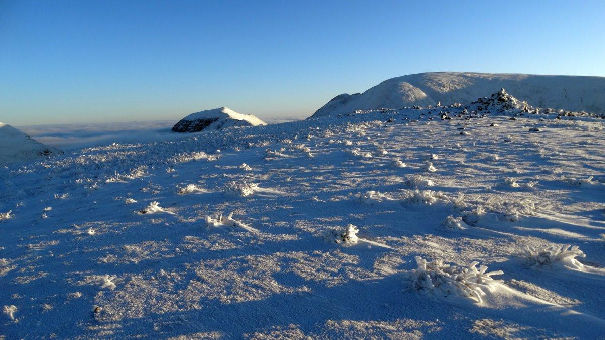 Out of the inversion and looking for the track up to Dollywagon Pike.
