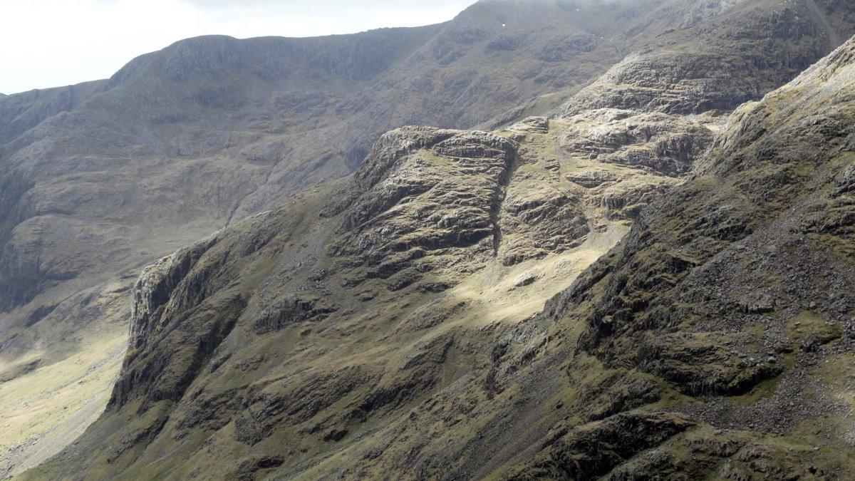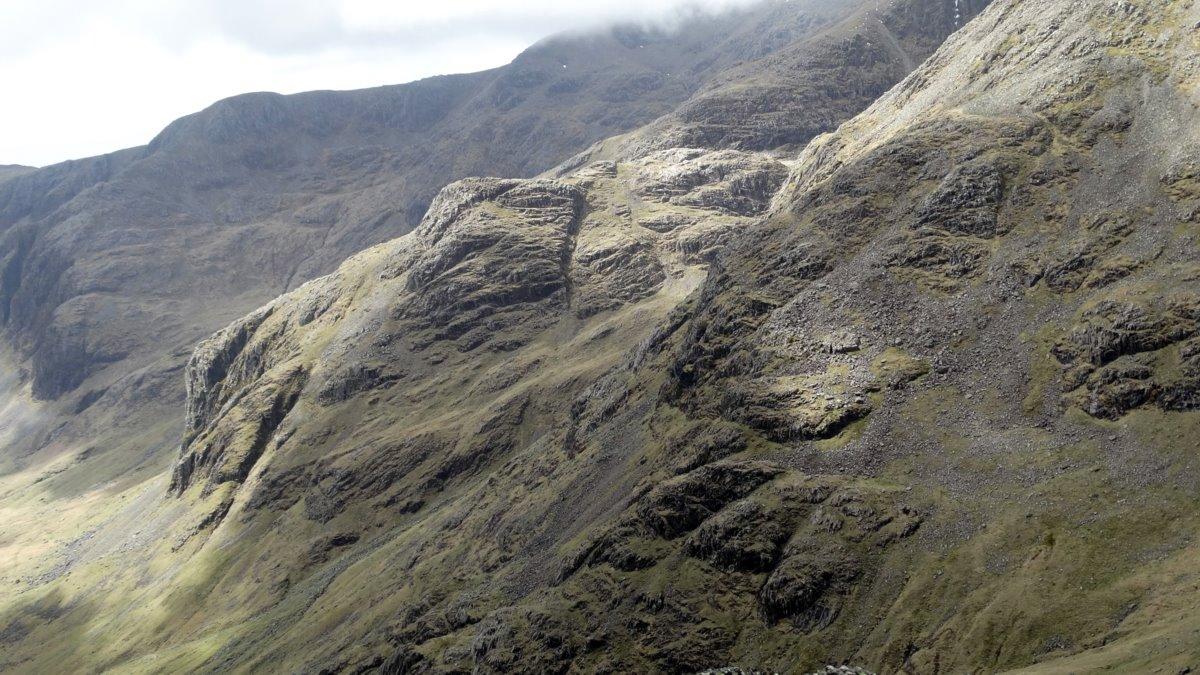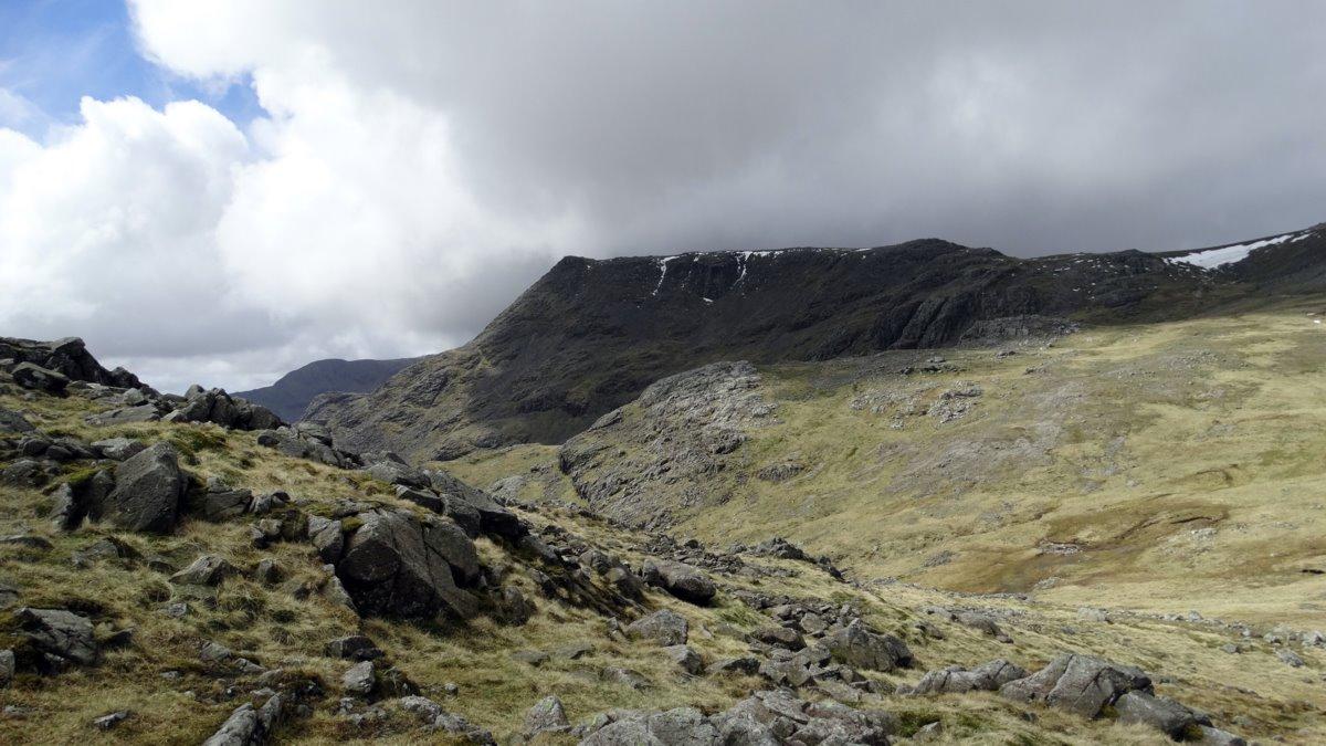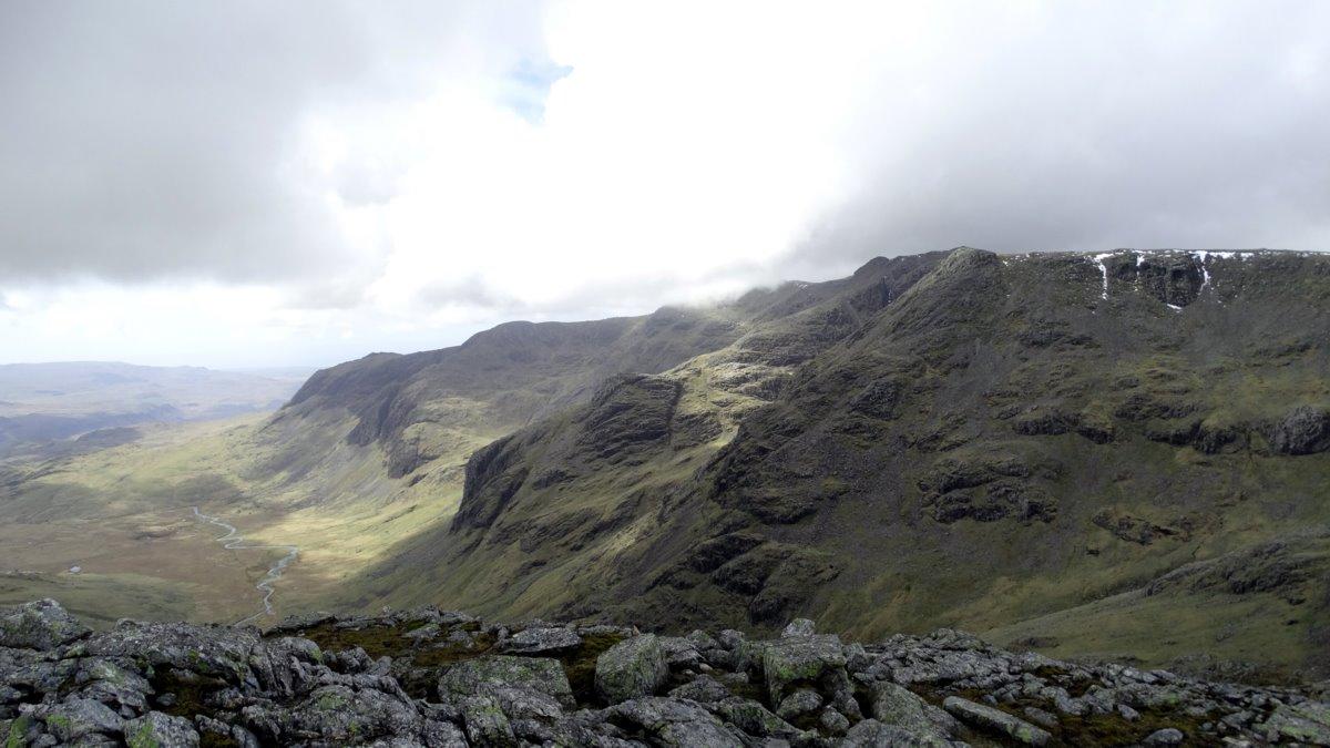 From Broadcrag col looking down Little Narrowcove. Pen below on the right.